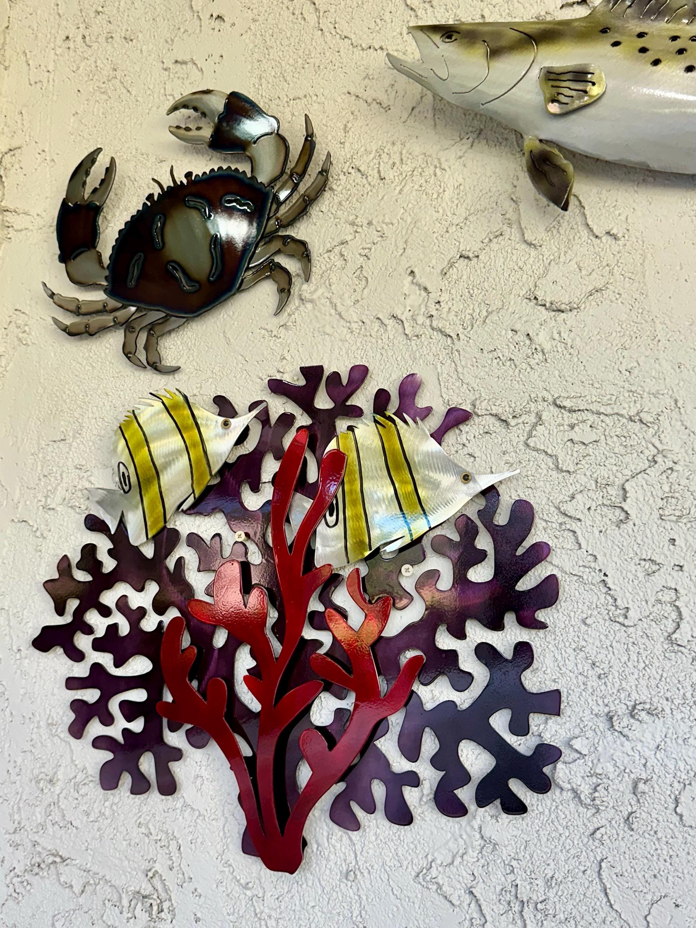 At 16" tall by 20" wide, this plasma cut coral reef and copperband butterfly fish sculpture in aluminum contains multiple layers. The aluminum is fastened with spacers and studs to give this oiece more 3d effect. This item is one of a kind! Finished by airbrushing and then powdercoated with clear to protect the finish from oxidizing. No worry about keeping this outside, enjoy it anywhere. Each on of these is different and made to order. Custom sizes available, priced for a version 20" wide. I can customize the airbrushing to your color liking, just ask!