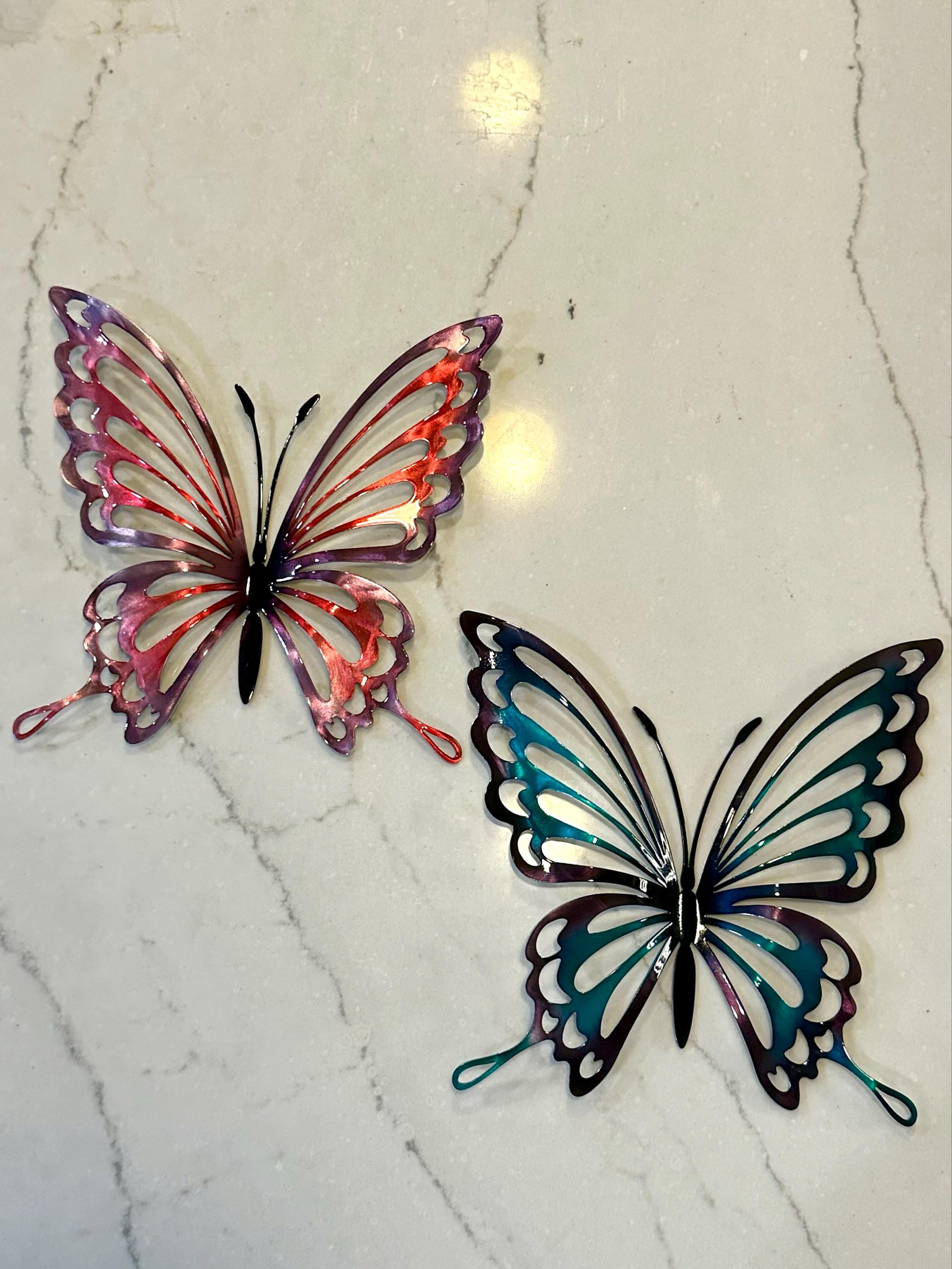 Our Metal Butterfly Wall Art is a perfect addition for the nature lover in you. Featuring 4 whimsical, flying butterflies, these beautiful pieces are approximately 8" wide by 7" tall, each. Plasma cut from 16 gauge aluminum, our Butterfly decor is then shaped and ground by hand to add depth and dimension to each piece. For those of us familiar with the salt air, we know what salt can do to steel over time. That's why we've created our metal decor using aluminum rather than steel. Aluminum reacts to the elements differently and is therefore not susceptible to rust. Additionally, aluminum is much more light weight than steel counterparts, putting less load on your walls. Although aluminum doesn't weigh as much, this does not speak to the durability of this metal. With no rusting, easy hanging ability, and long term durability, our aluminum metal home decor makes a perfect addition as indoor and outdoor home decor.